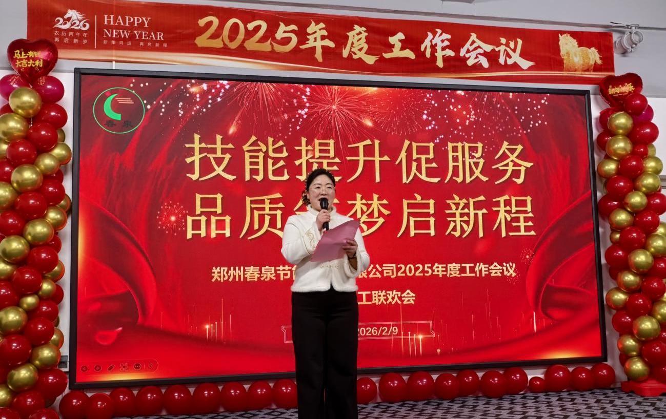 2025年2月9日,春泉节能年度工作会议暨员工联欢会在五楼大会议室隆重举行,这是公司入住新居以来的首次年会。全体员工欢聚一堂,共同回顾2025年的奋斗历程,展望2026年的发展蓝图。年会以“技能提升促服务,品质筑梦启新程”为主题,设置了解读公司十大成就、年度总结、表彰先进、文艺表演、互动抽奖等环节,现场气氛热烈,掌声雷动不断。